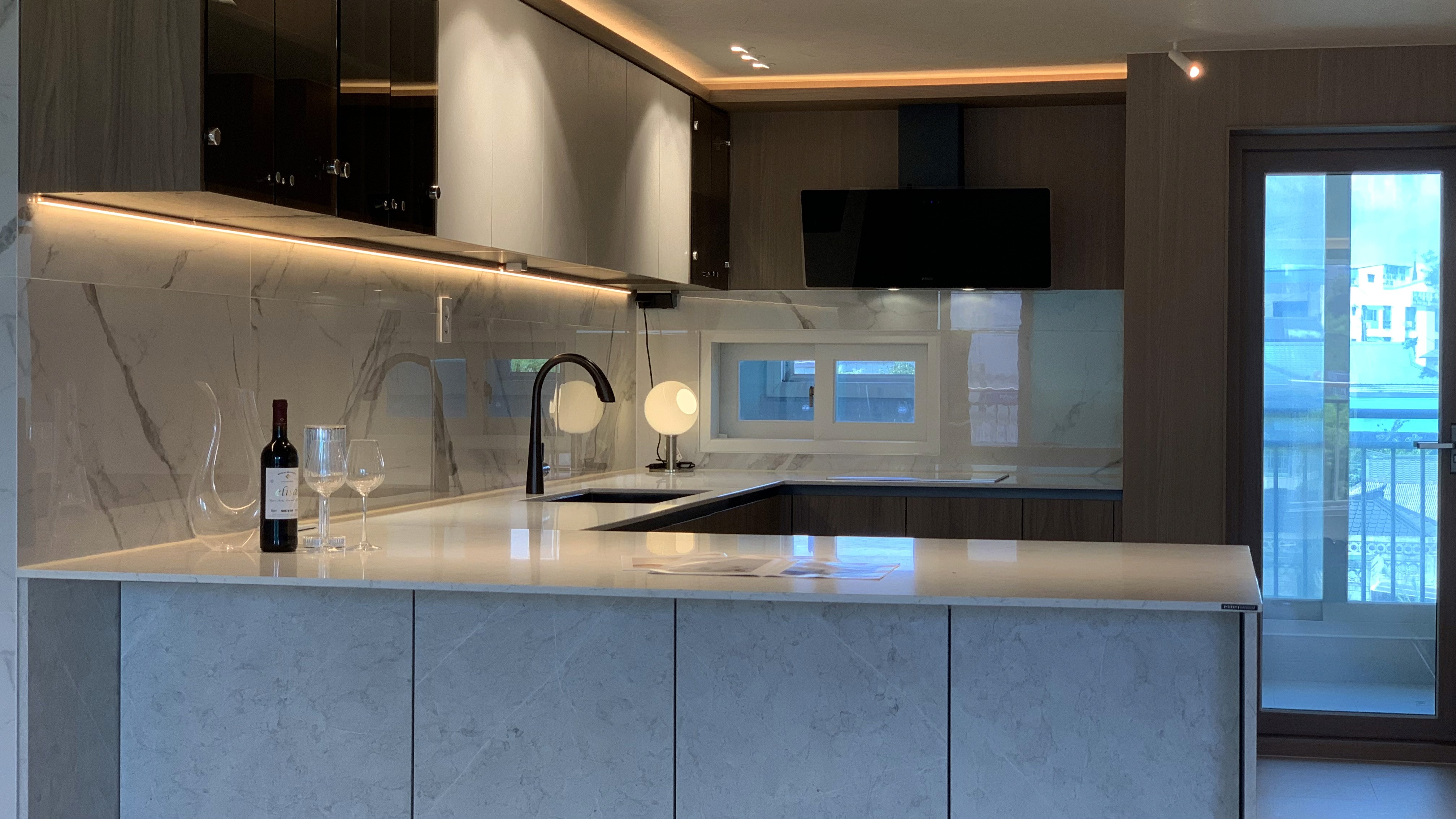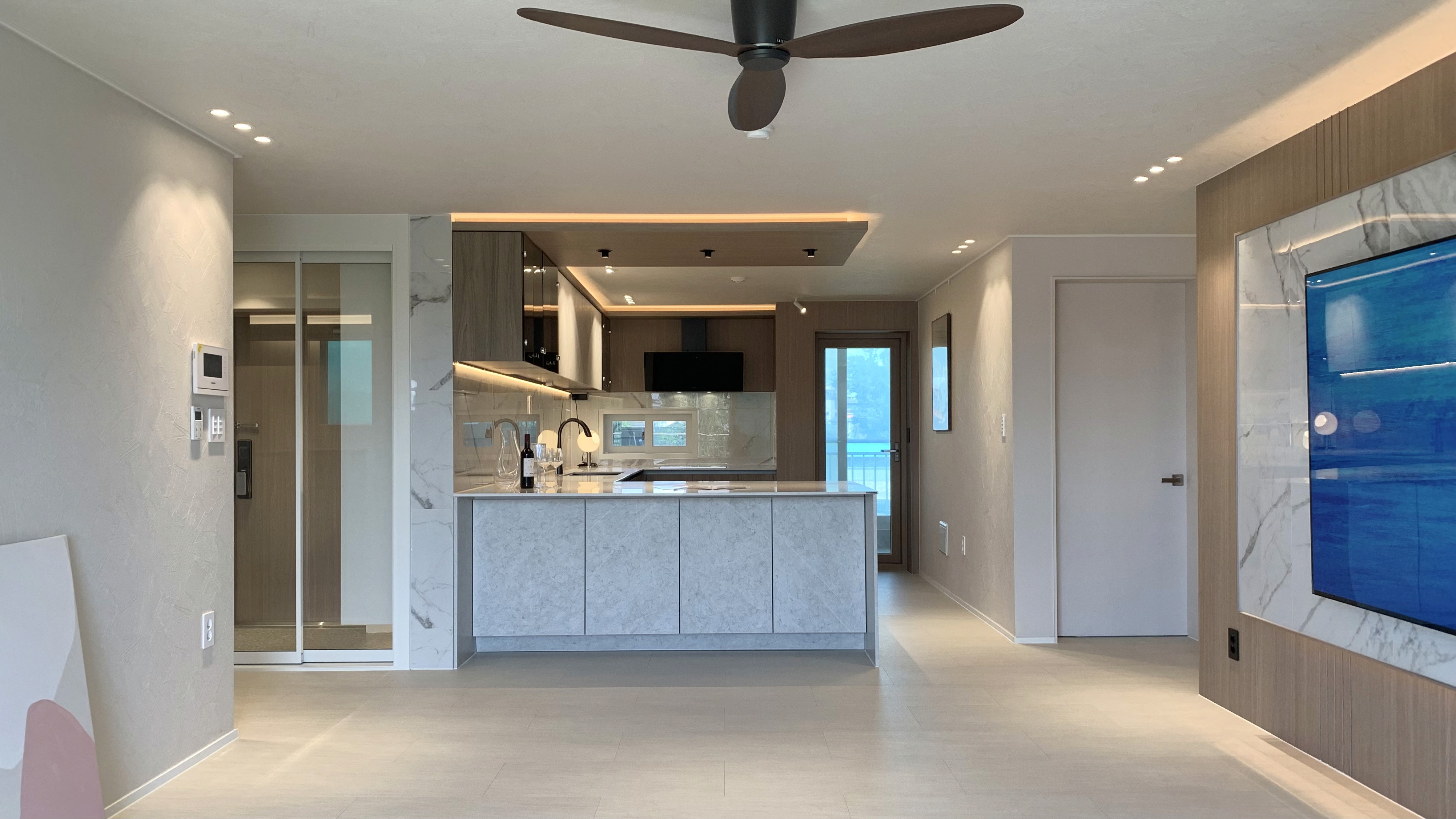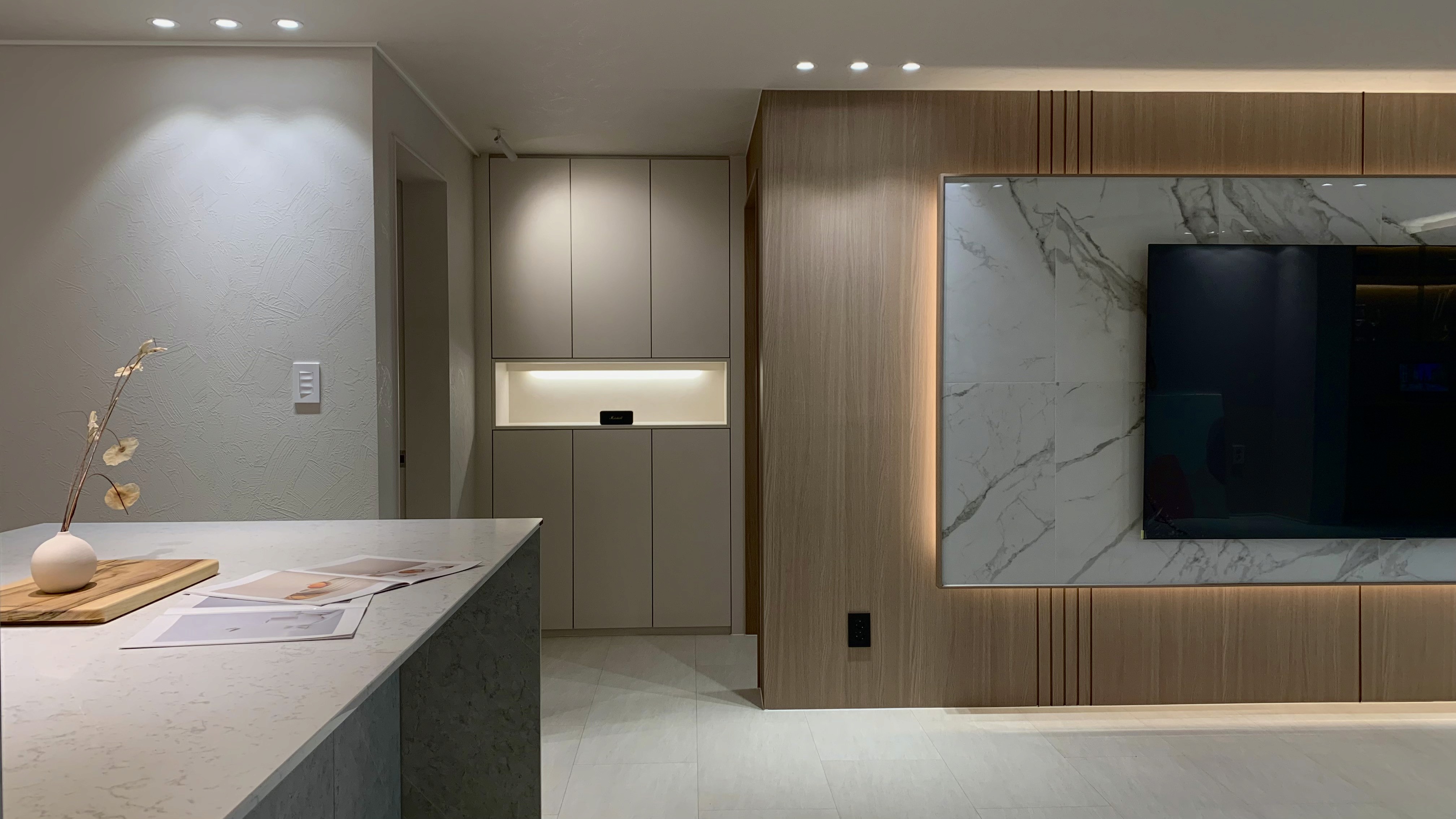 다크 우드의 깊이감과 스톤의 질감이 완벽한 균형을 이루는 모던 프리미엄 공간